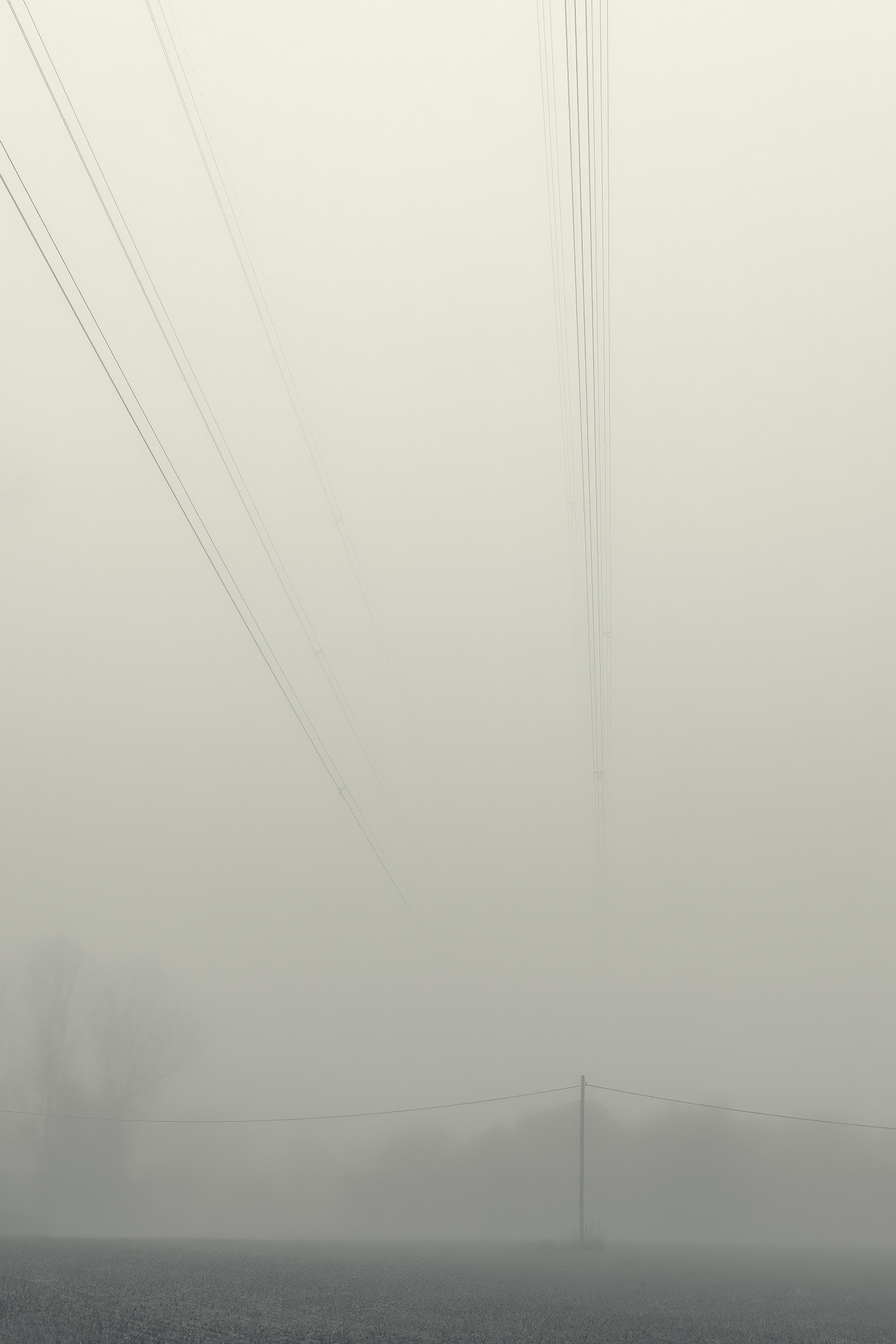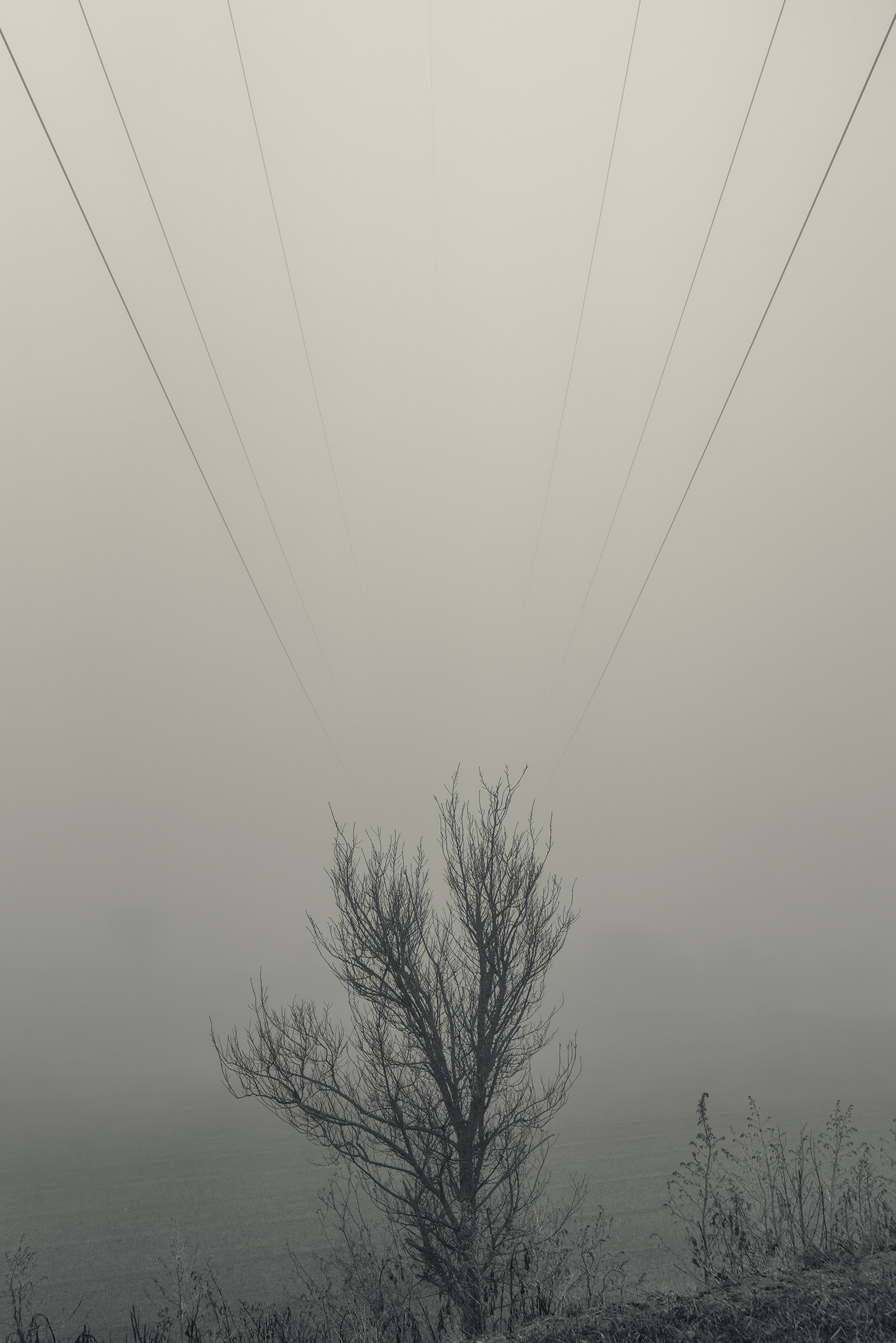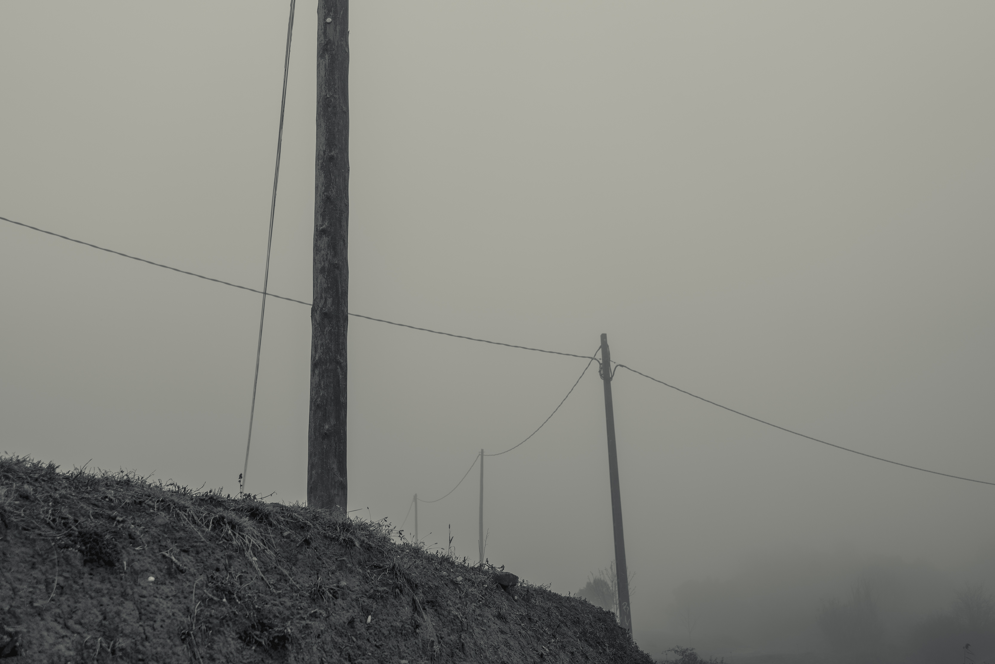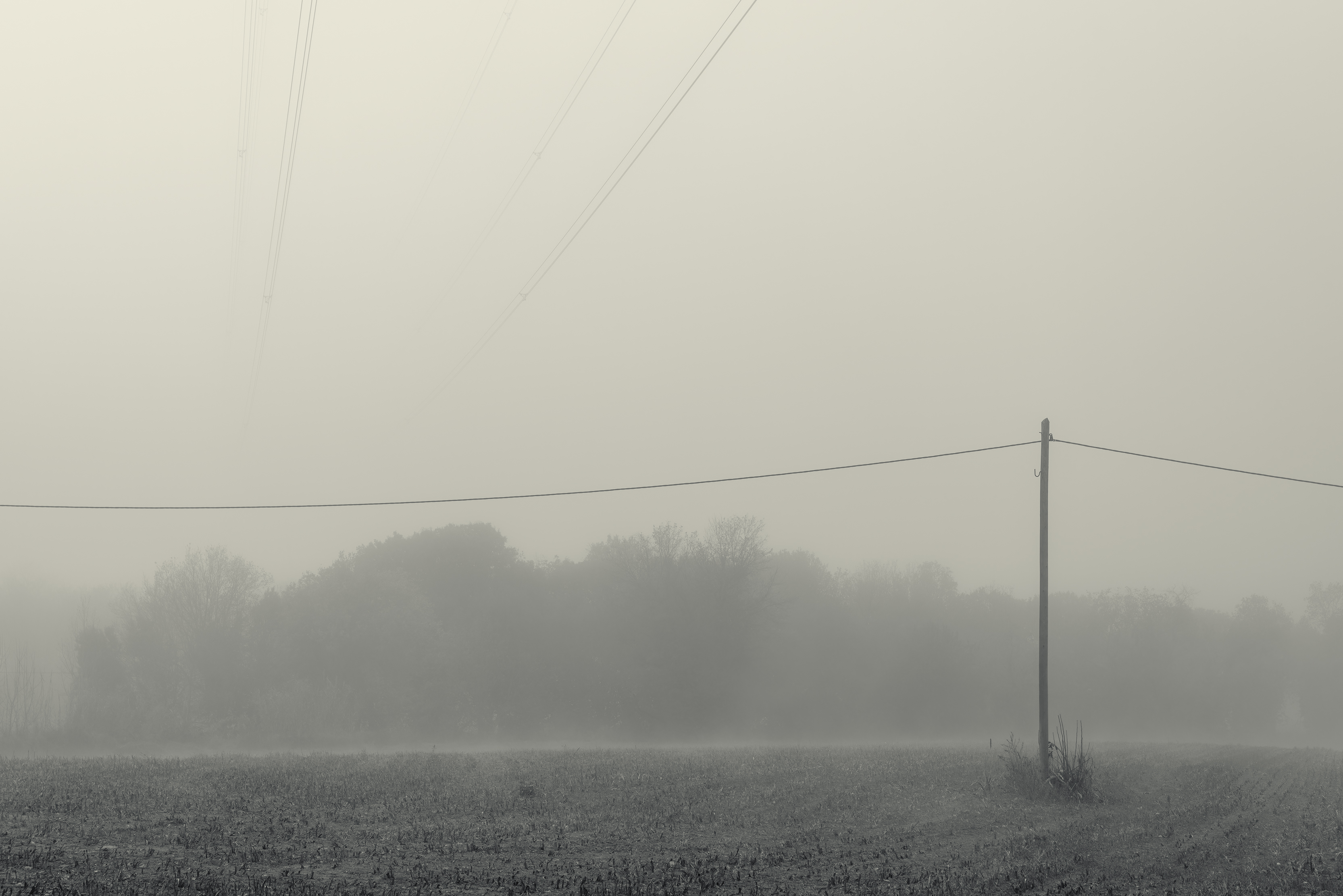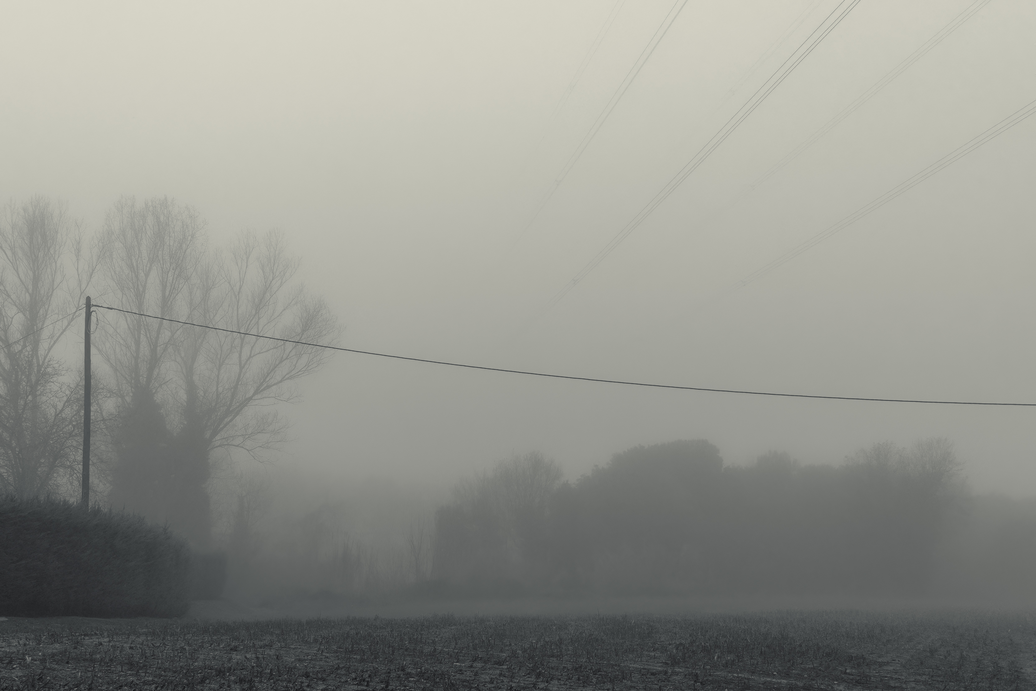 Es invierno. Hace frío y la niebla lo devora todo, excepto los cables que cortan el cielo como heridas abiertas y se alzan sobre el campo desnudo, extendiendo su quietud metálica sobre la nada.