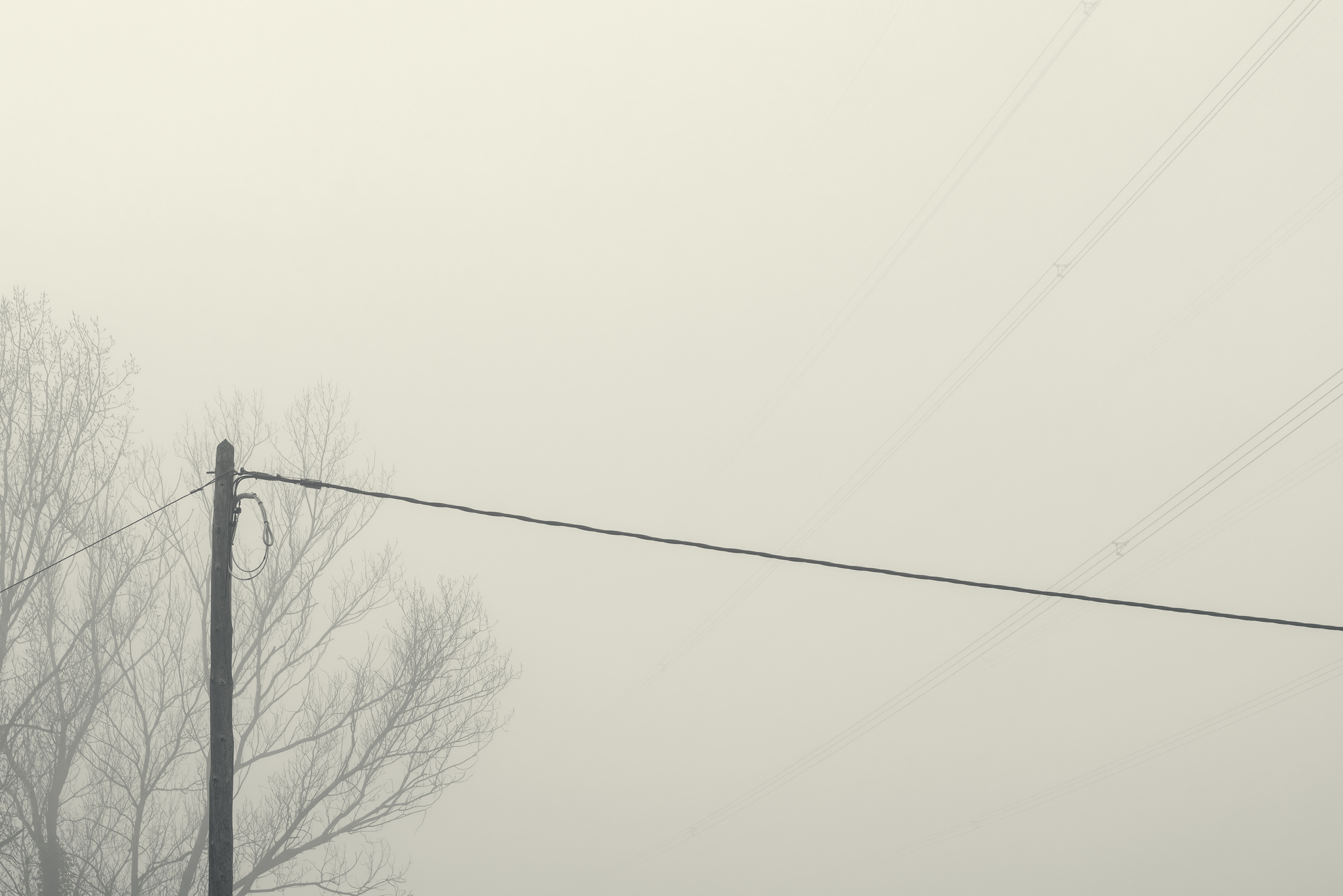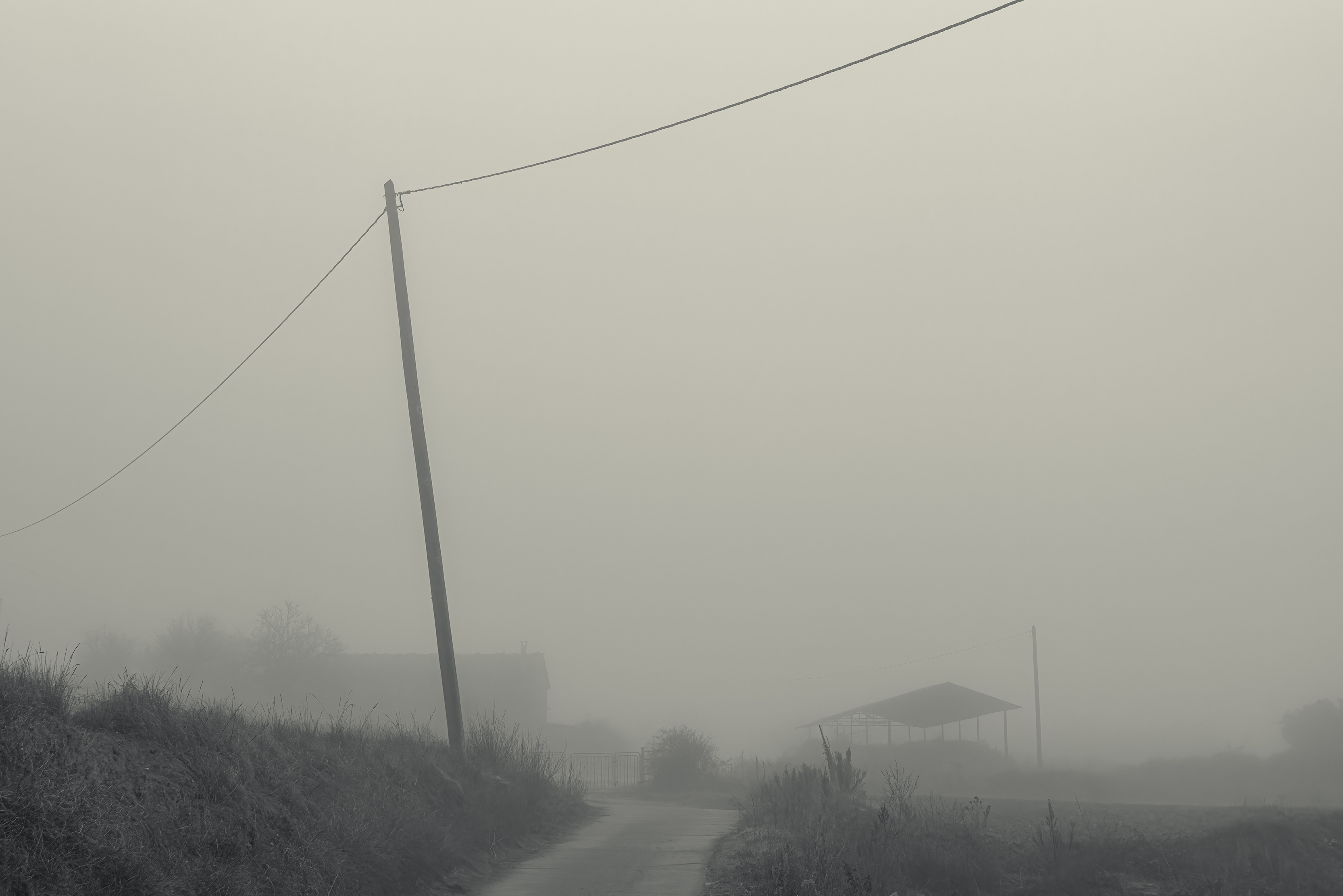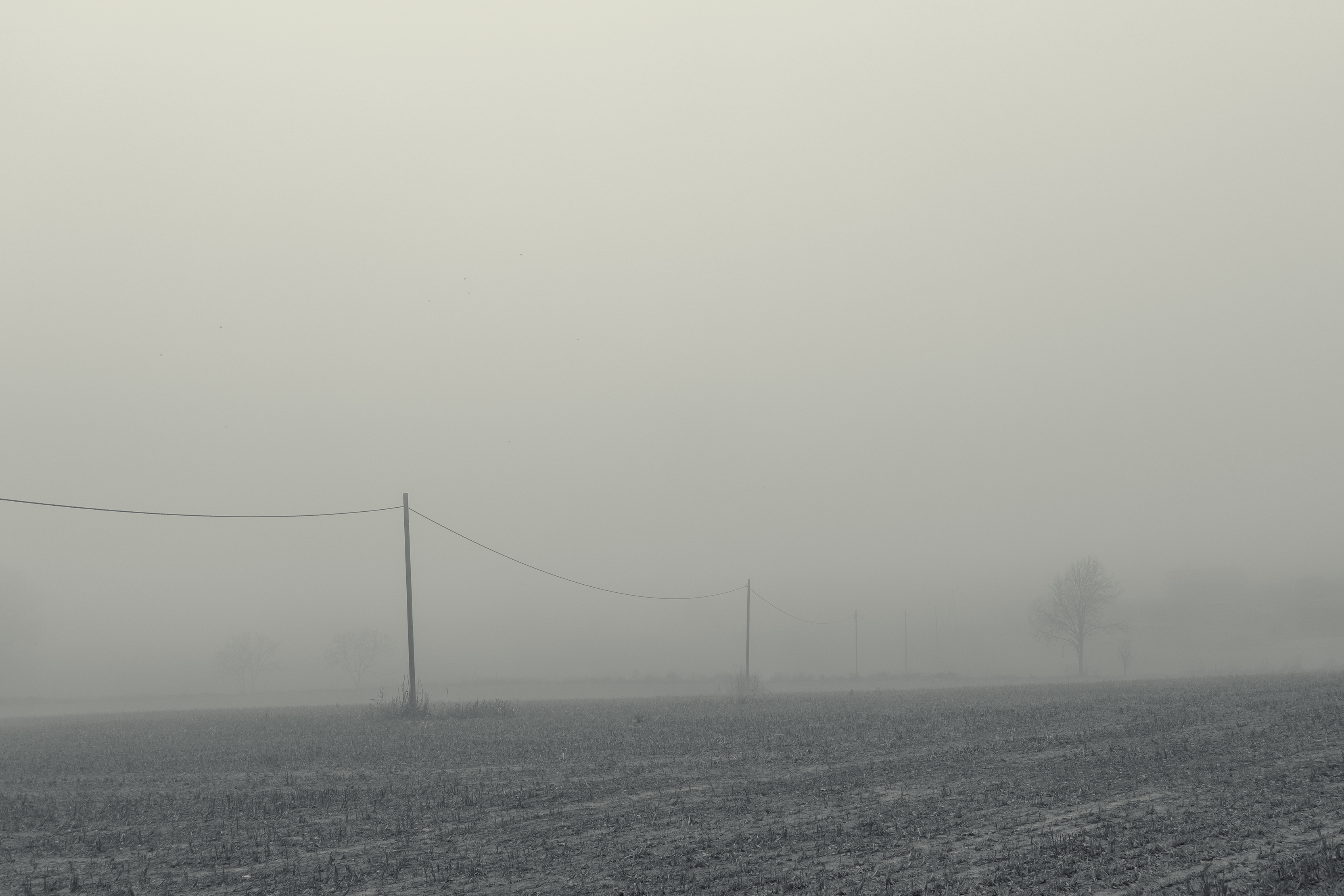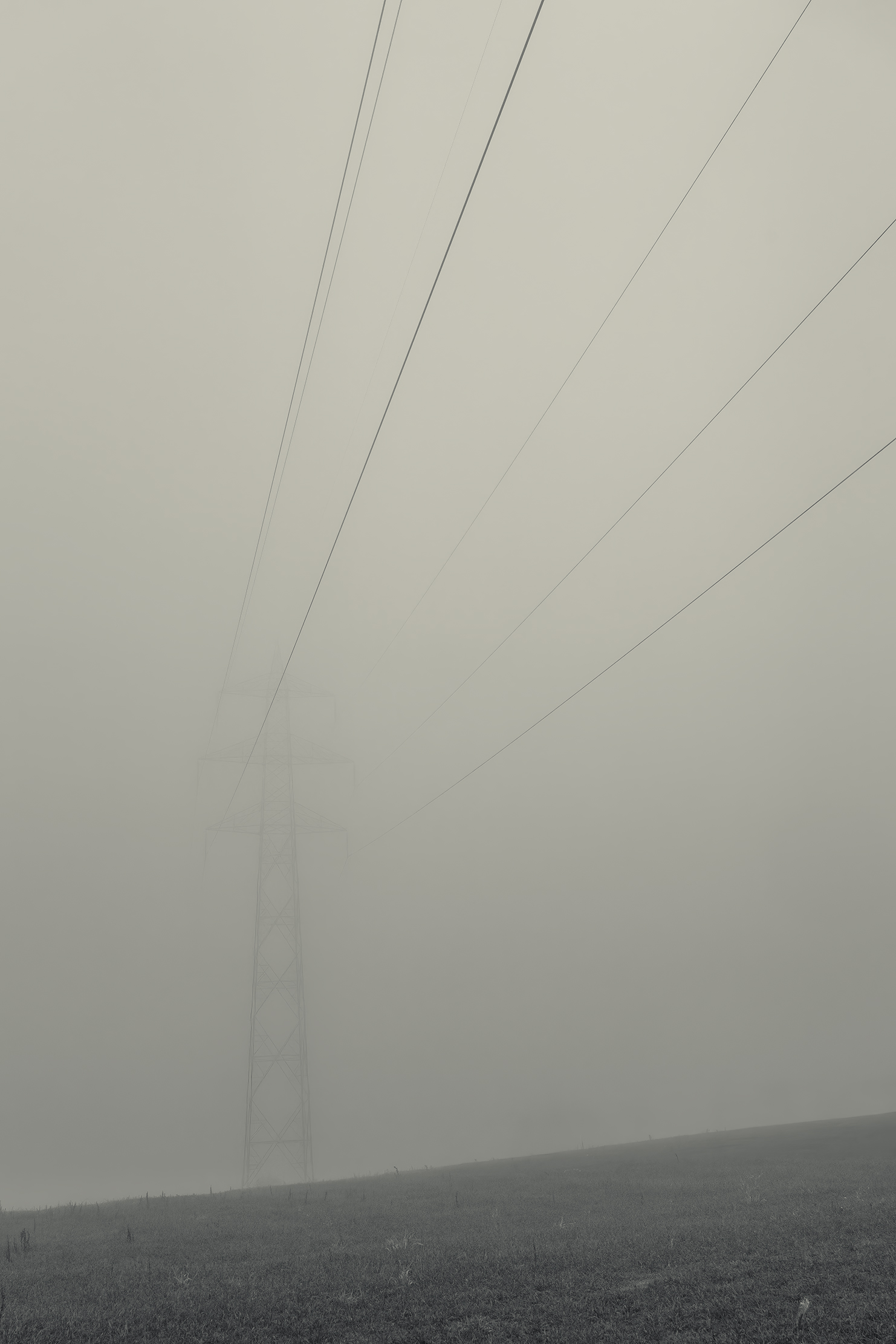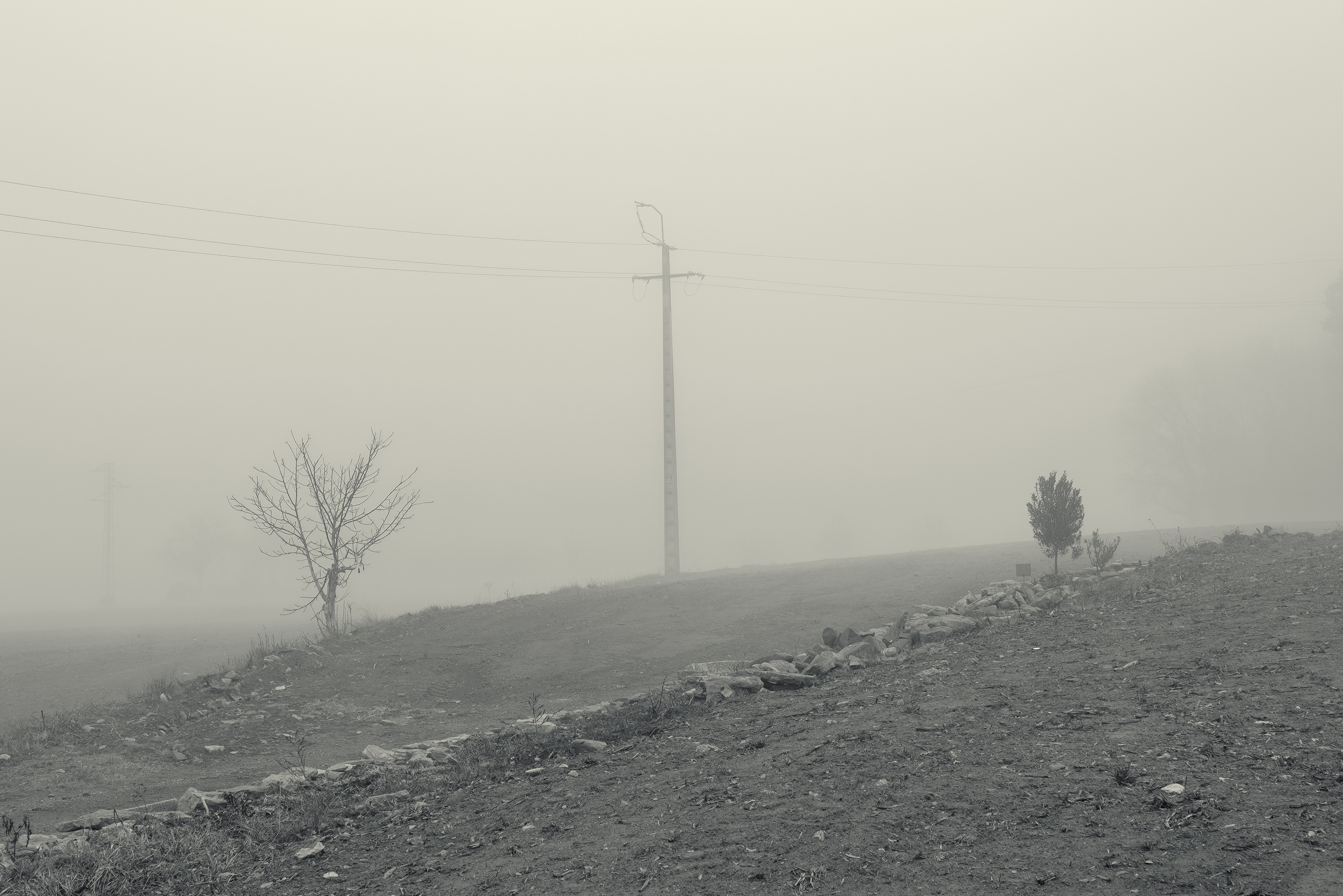 Es invierno. Hace frío y la niebla lo devora todo, excepto los cables que cortan el cielo como heridas abiertas y se alzan sobre el campo desnudo, extendiendo su quietud metálica sobre la nada.