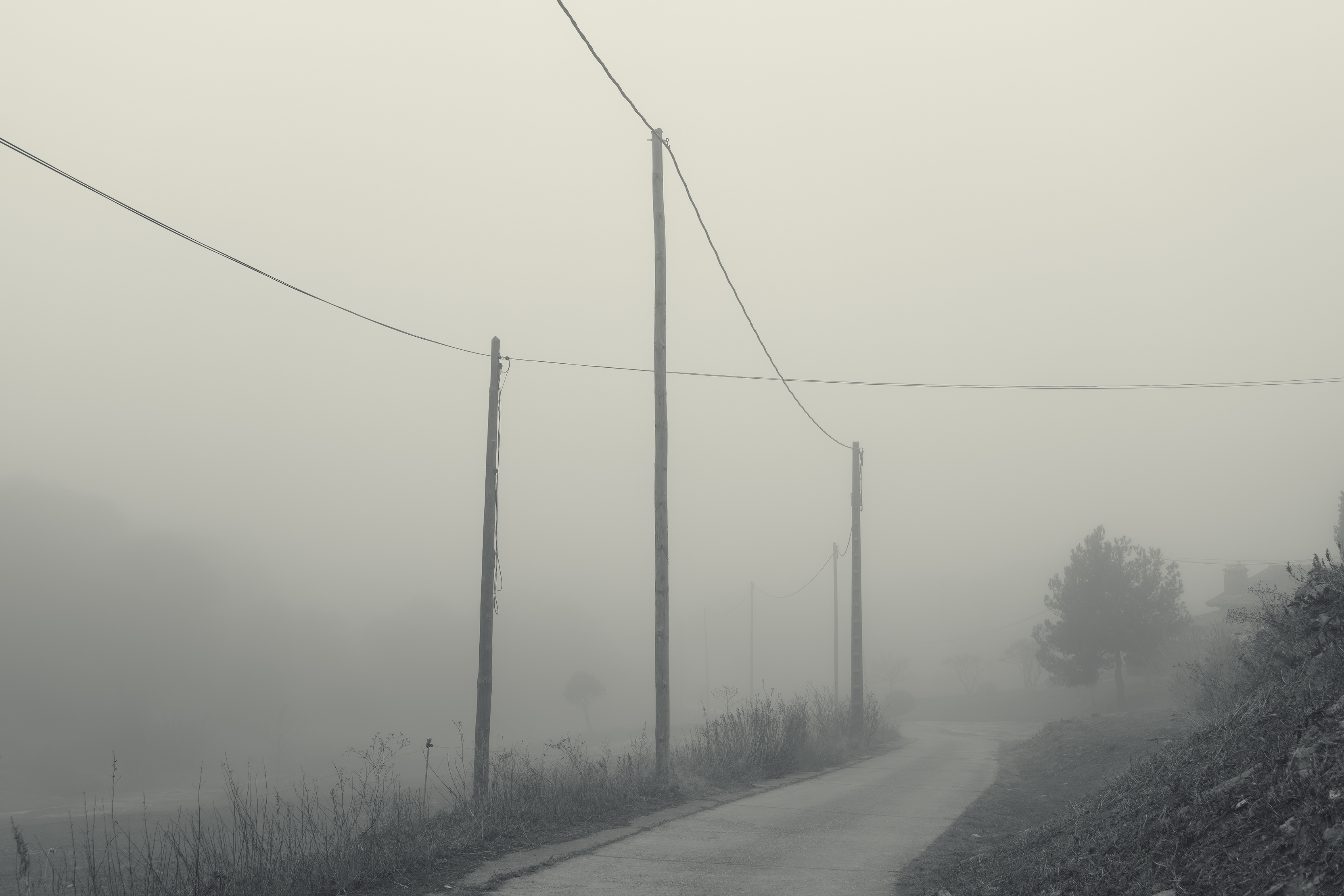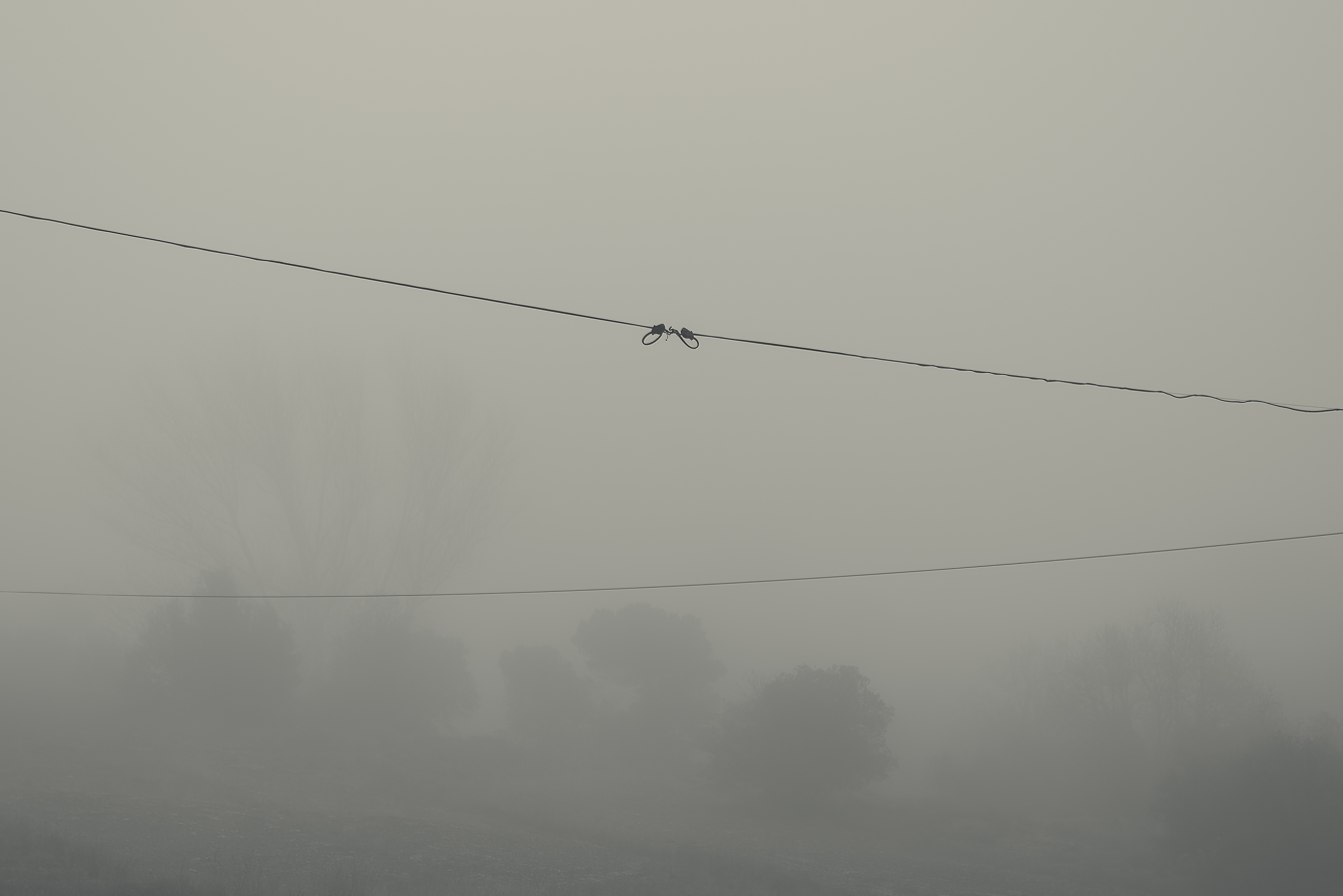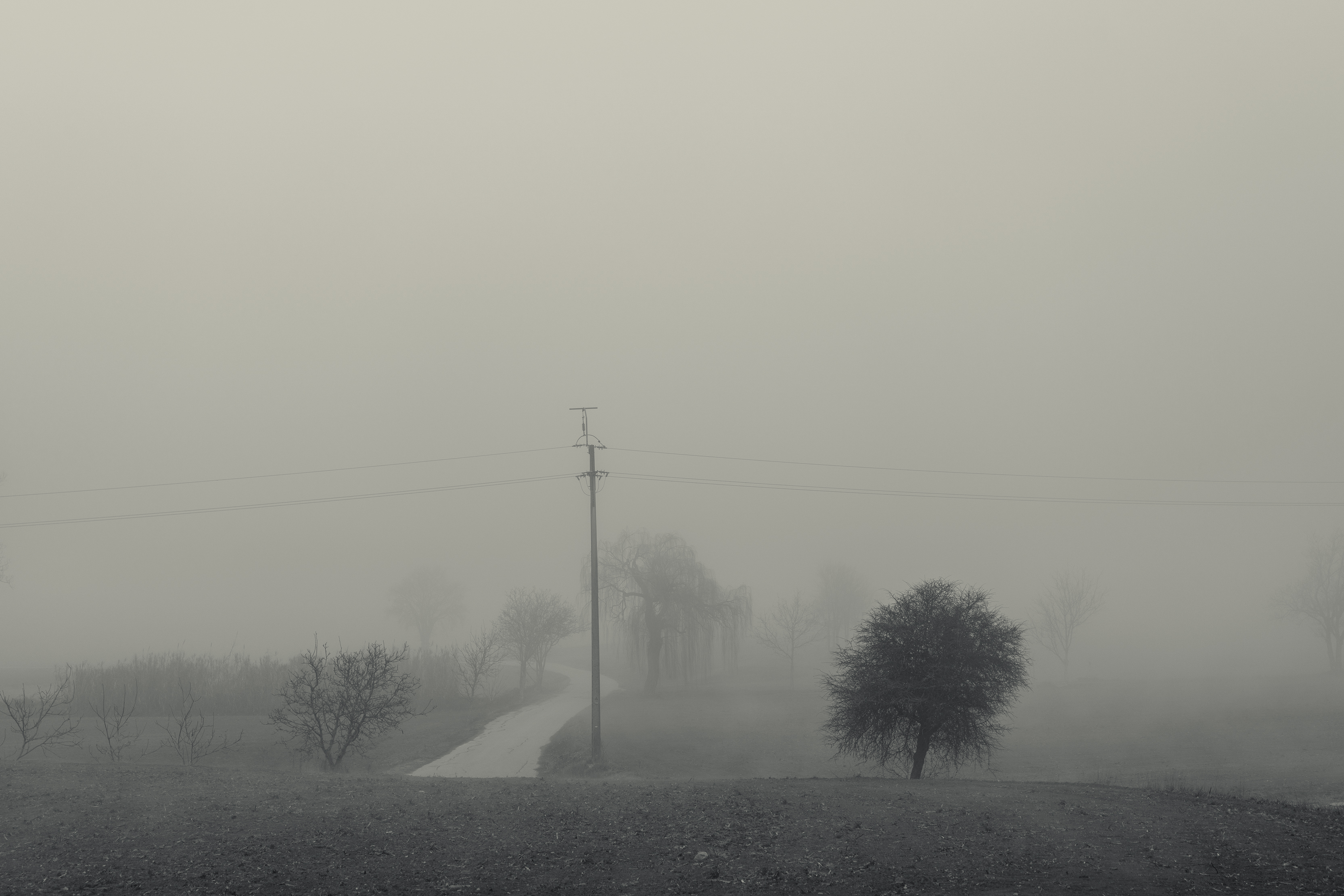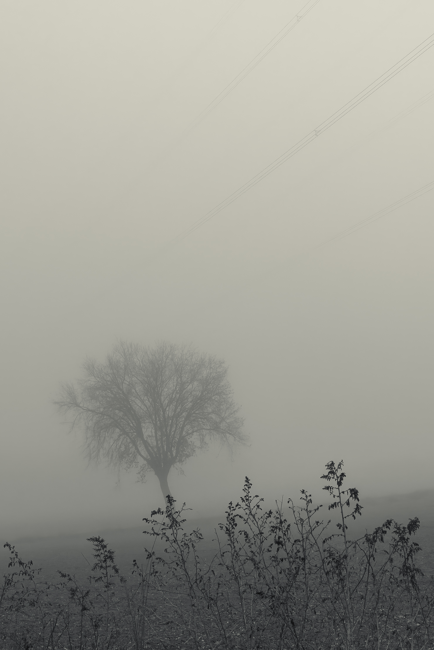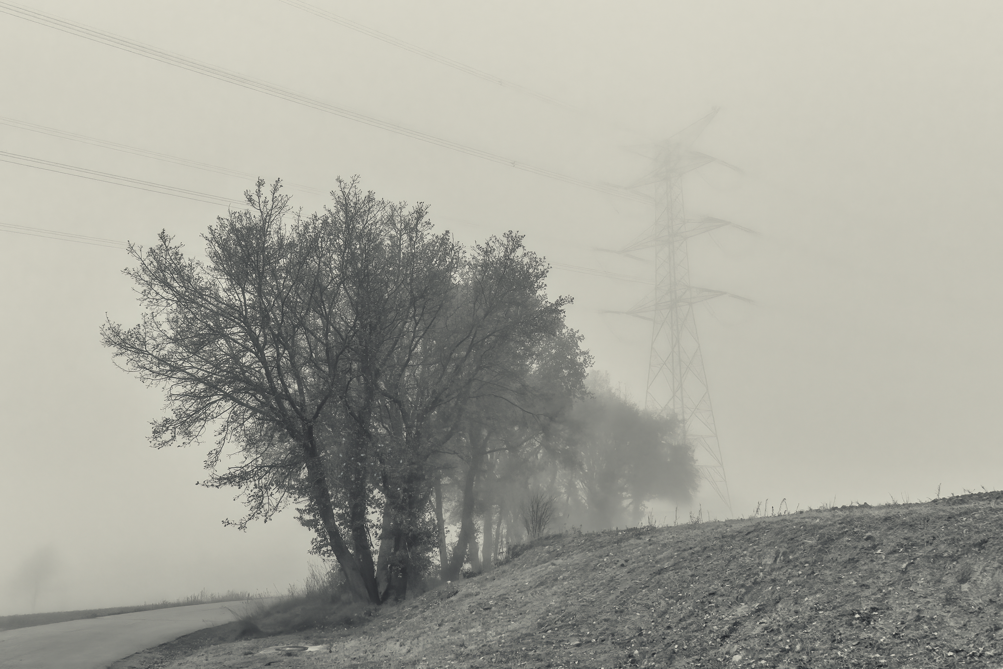 Es invierno. Hace frío y la niebla lo devora todo, excepto los cables que cortan el cielo como heridas abiertas y se alzan sobre el campo desnudo, extendiendo su quietud metálica sobre la nada.