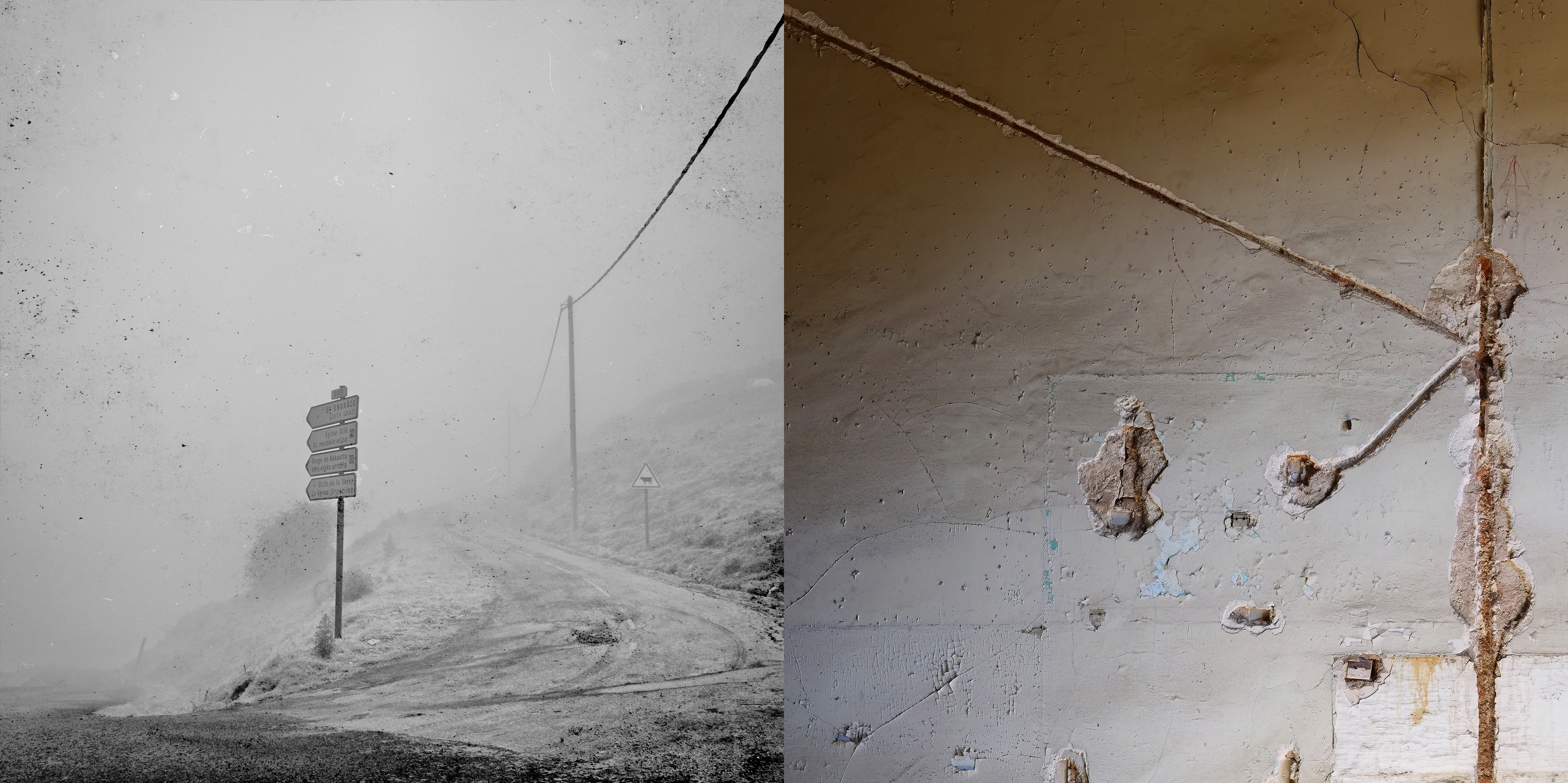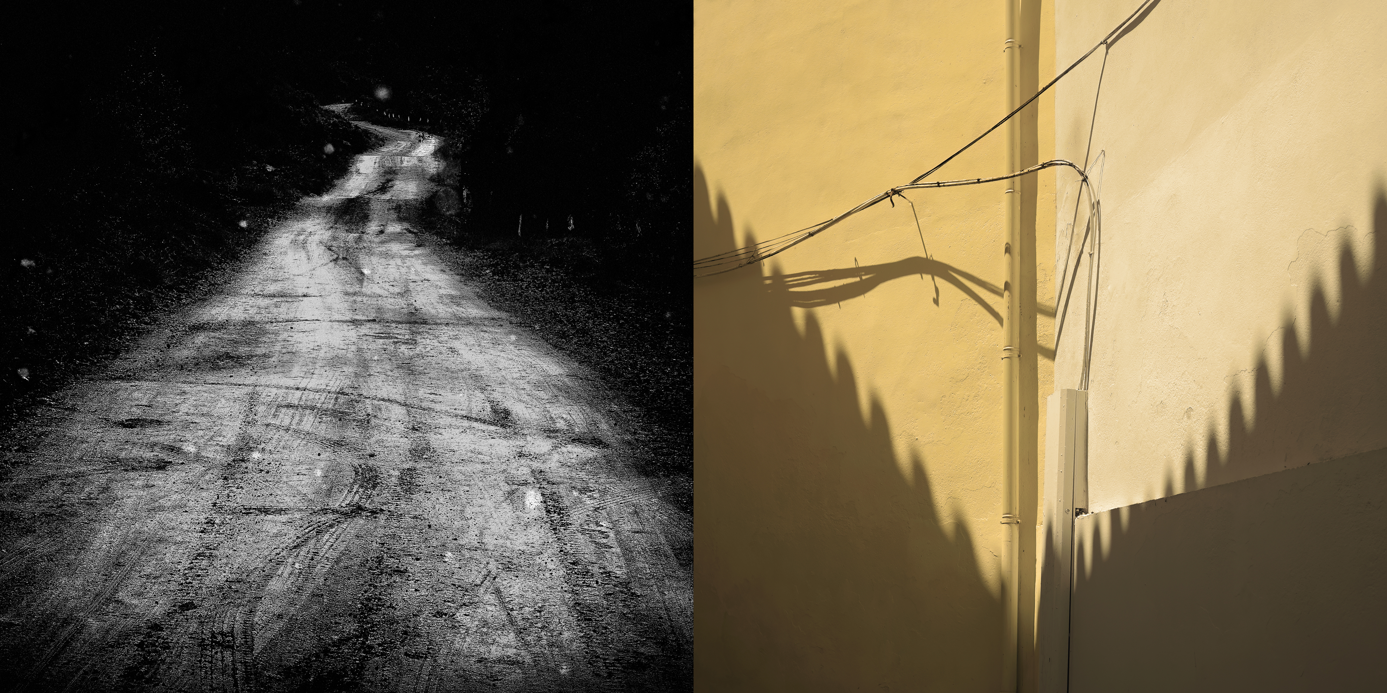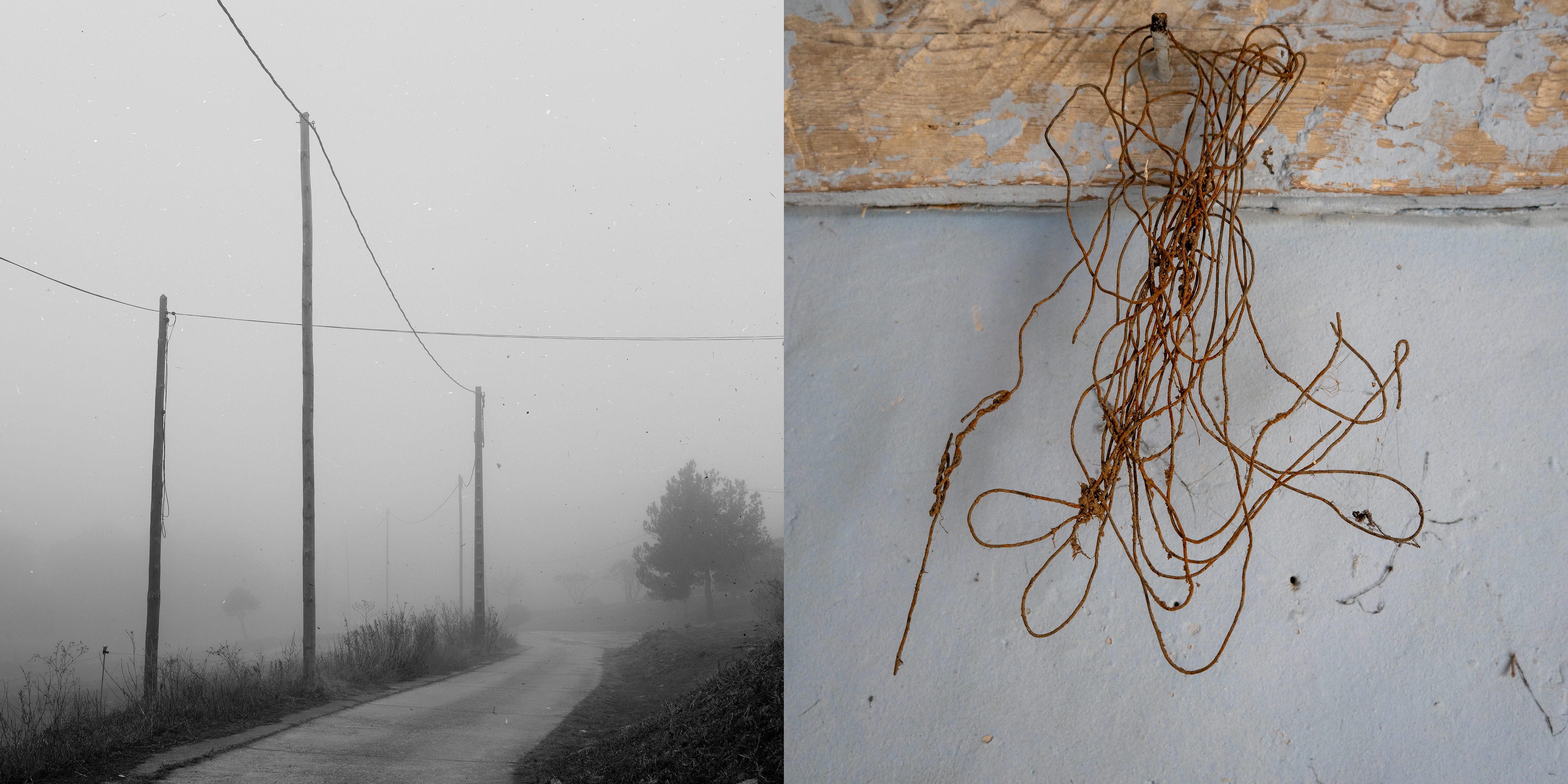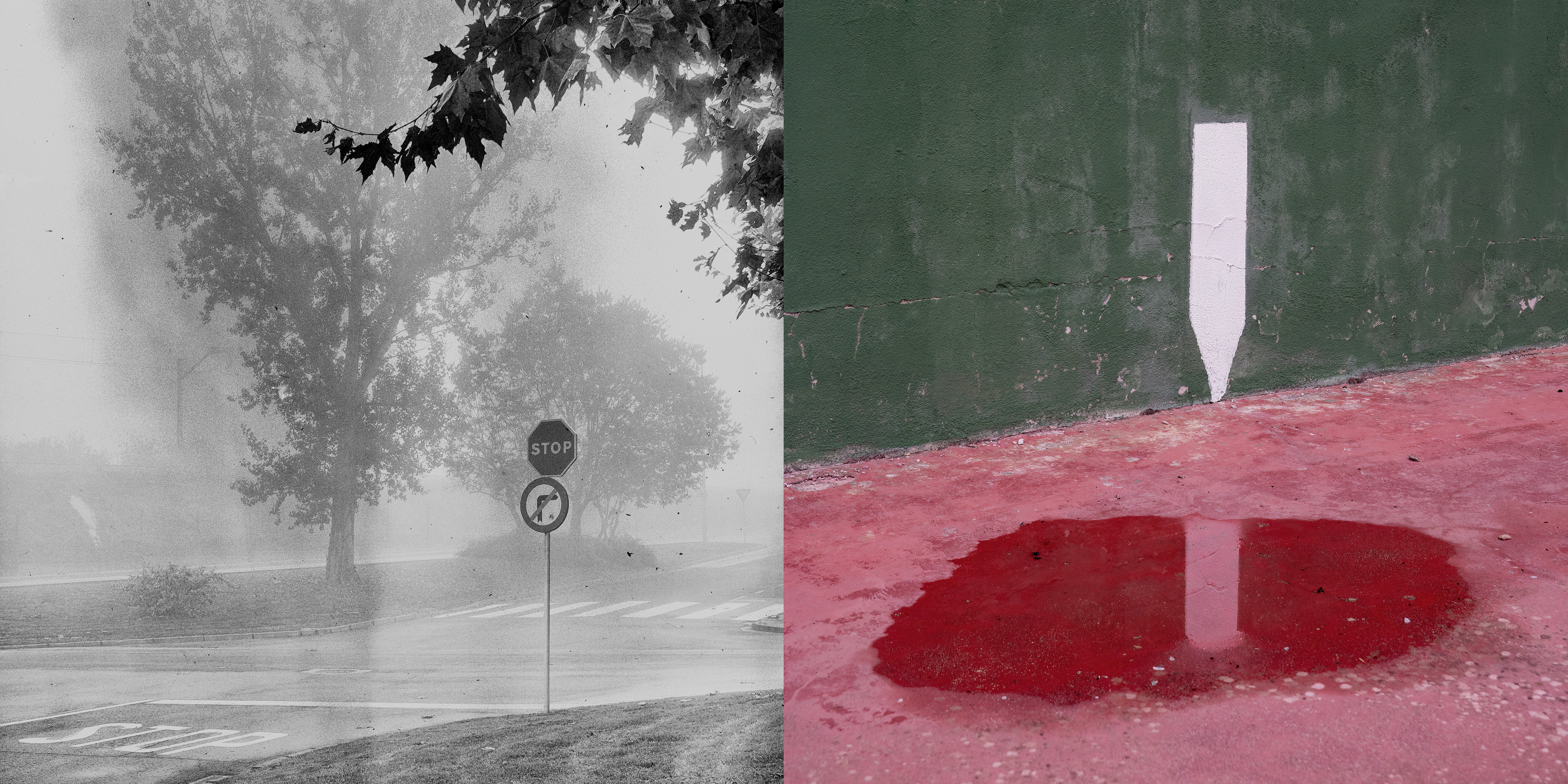 Cada díptico funciona como un nodo: un punto de cruce entre lo observado y lo evocado, entre lo concreto y lo mental. Las fotografías en blanco y negro remiten al trayecto real, donde la mirada se depura. Las imágenes en color aparecen como asociaciones libres: recuerdos imprevistos que surgen sin orden ni lógica. Como una escritura sin argumento, estas imágenes no cuentan una historia. Funcionan más bien como notas: conexiones sueltas de pensamiento sin palabras más cercanas al silencio que a la interpretación.