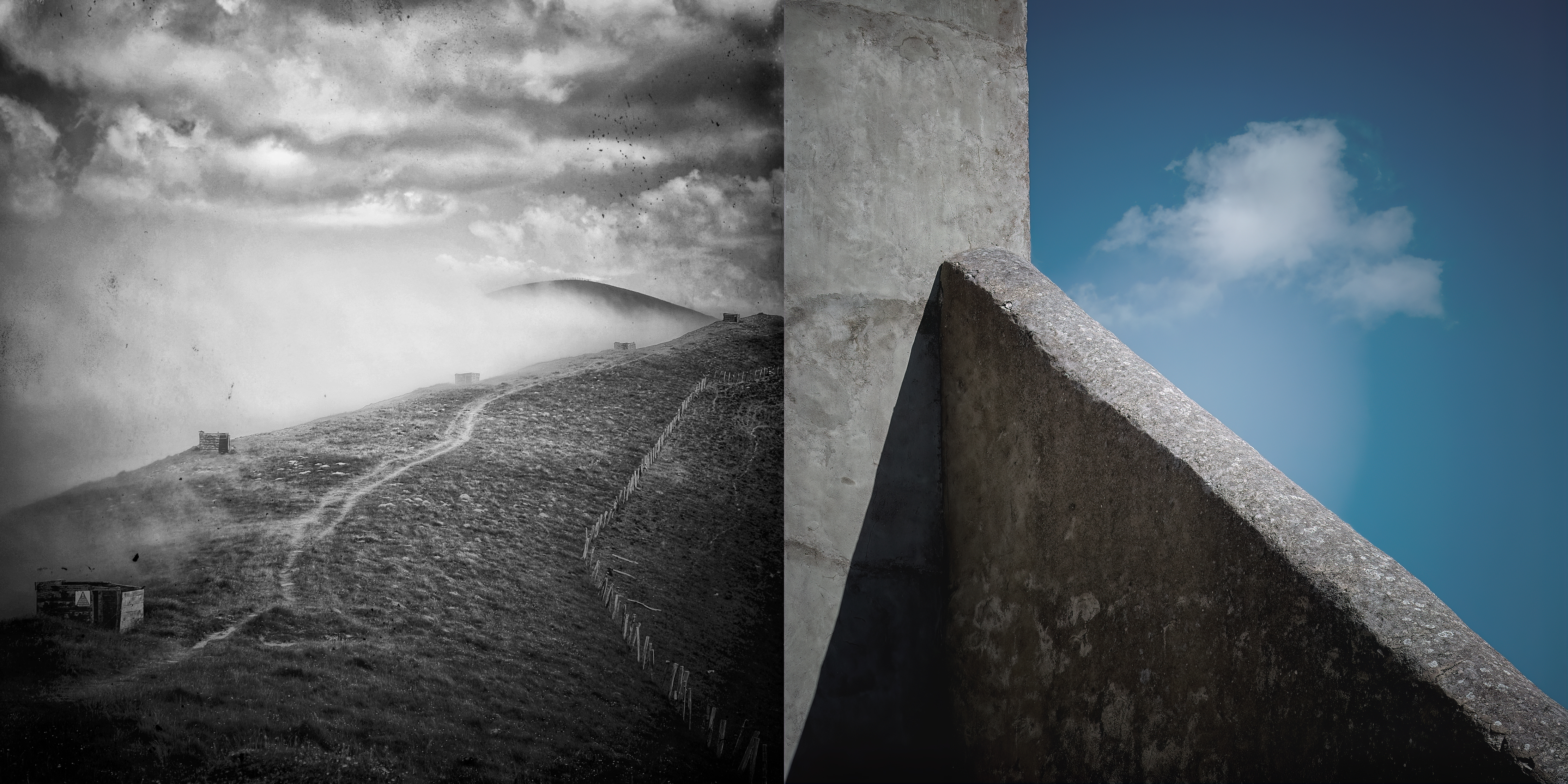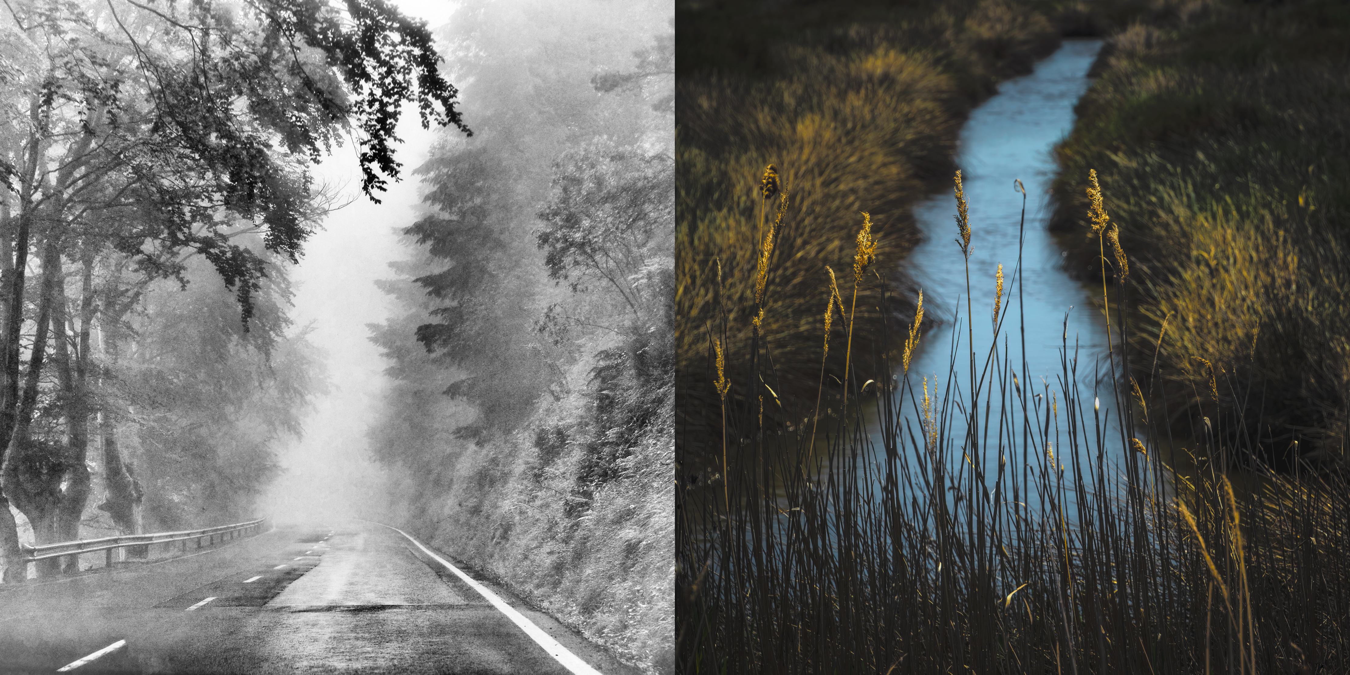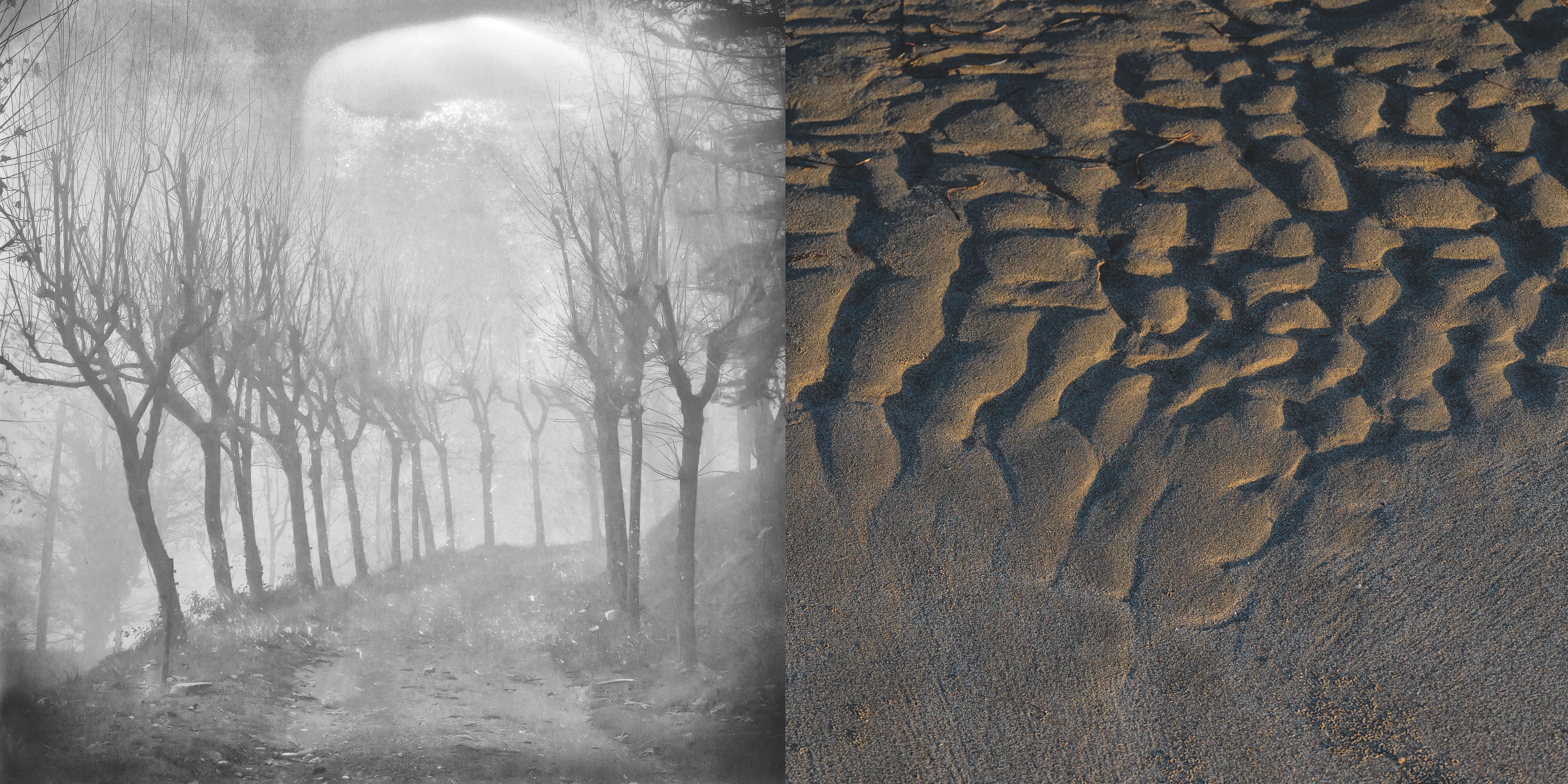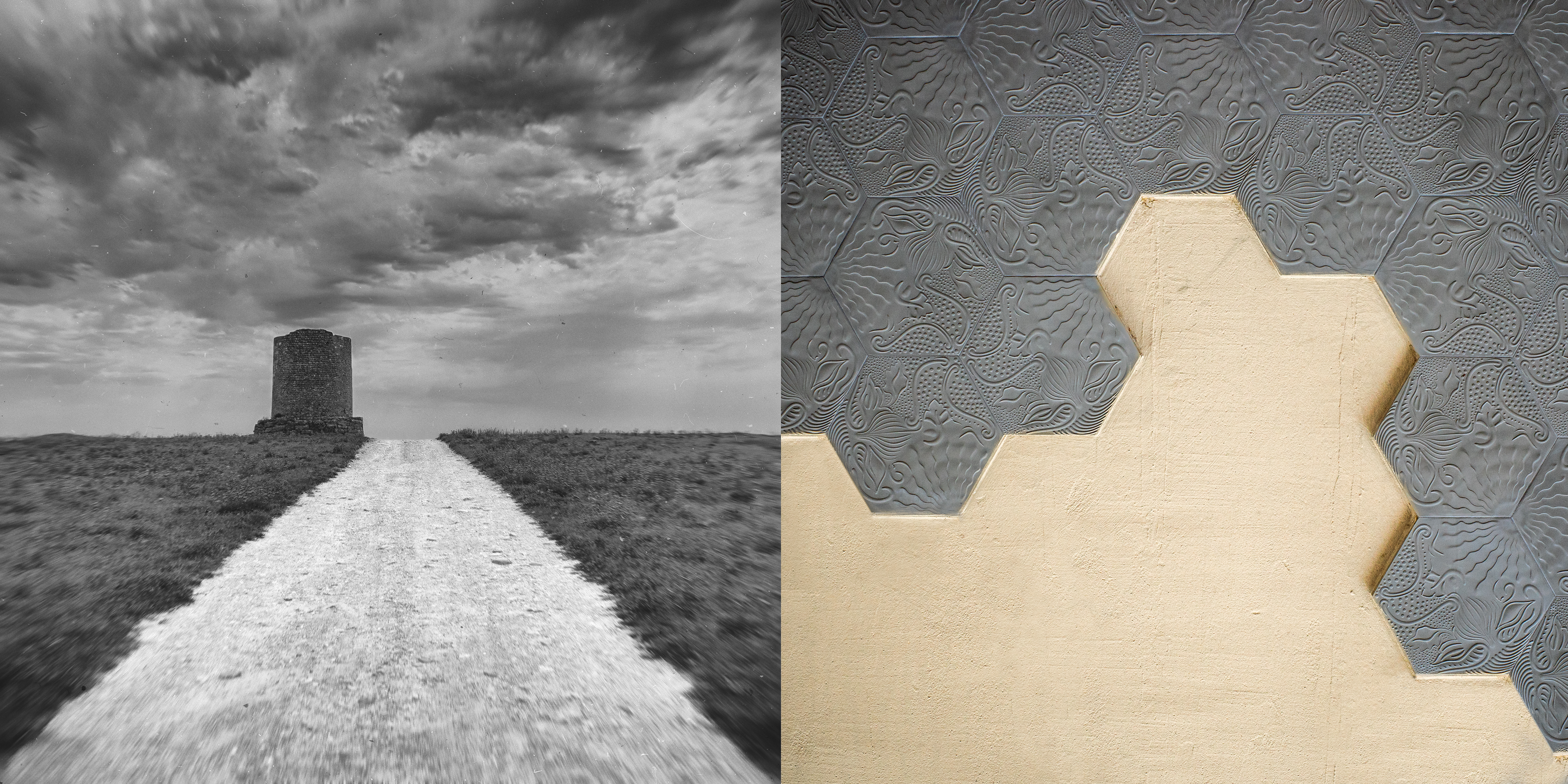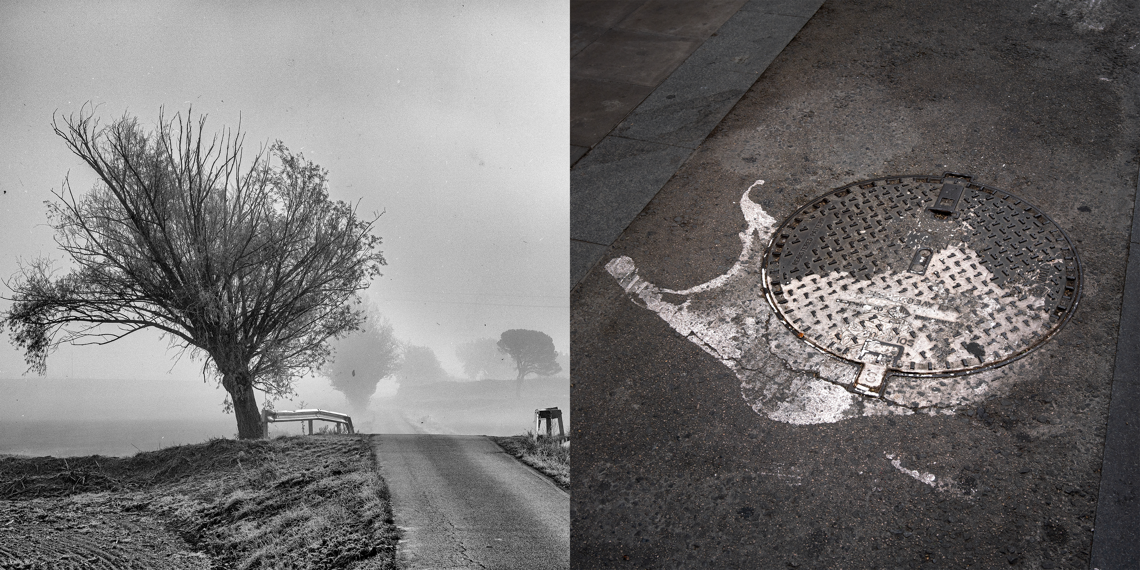“ NODOS I ” - sendas - reúne 30 dípticos formados por caminos y carreteras que alguna vez caminé, junto a asociaciones visuales en color que surgen como destellos de memoria. No son lugares elegidos por su singularidad, sino por algo más leve: el modo que quedaron en el recuerdo. Fragmentos de tránsito, escenas mínimas detenidas sin propósito aparente, salvo el de atender a lo que ocurre cuando se deambula sin prisa.